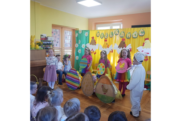 Dzieci z grupy Żabek przygotowały przedstawienie pt. „Dyrdymałki o pisankach”. Mali artyści z ogromnym zaangażowaniem zaprezentowali barwną i pełną humoru opowieść inspirowaną wielkanocnymi tradycjami.