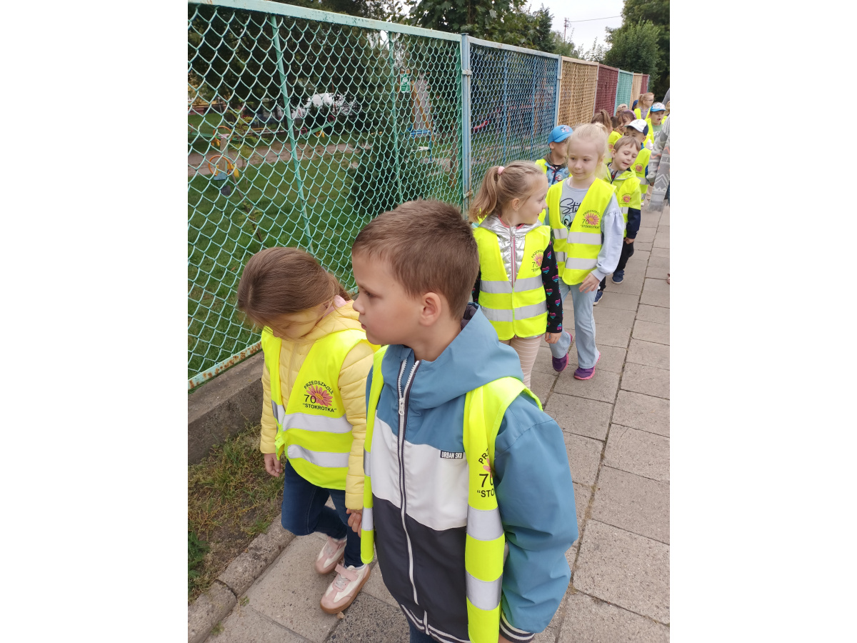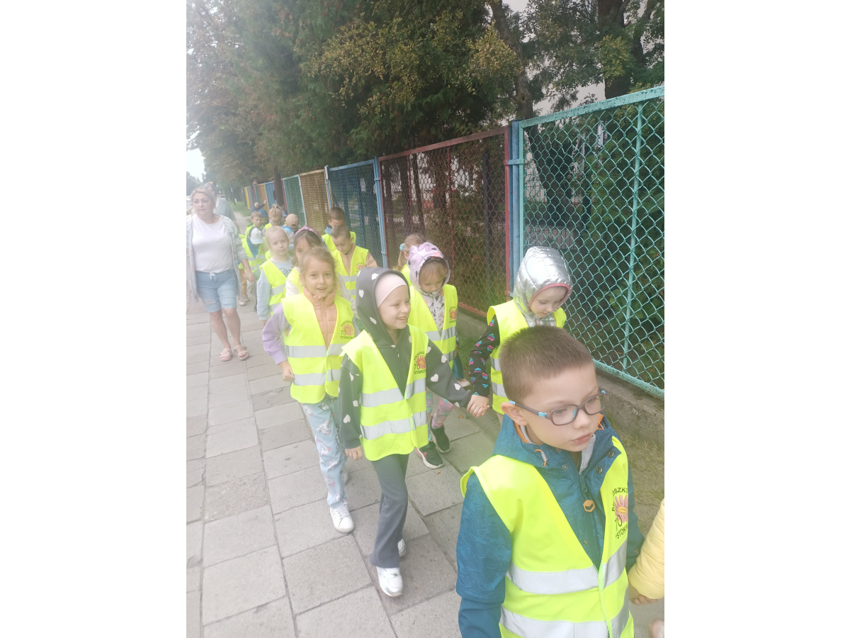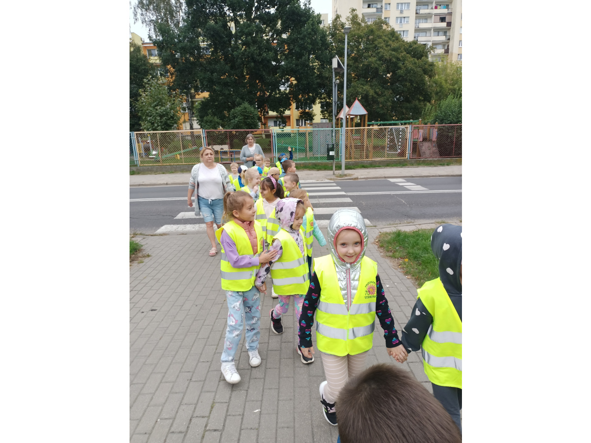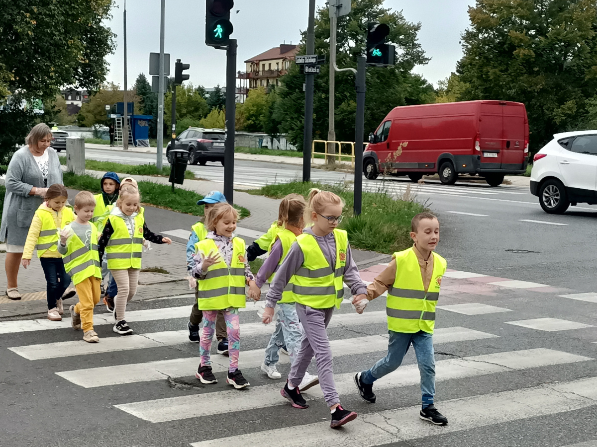 Dzieci z grupy Biedronek wybrały się na pobliskie skrzyżowanie, aby w praktyce utrwalić zasady bezpiecznego poruszania się w roli pieszego.