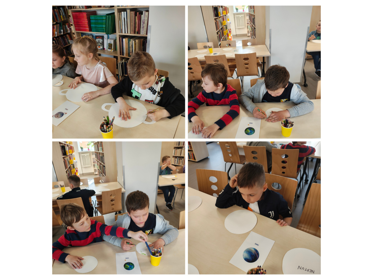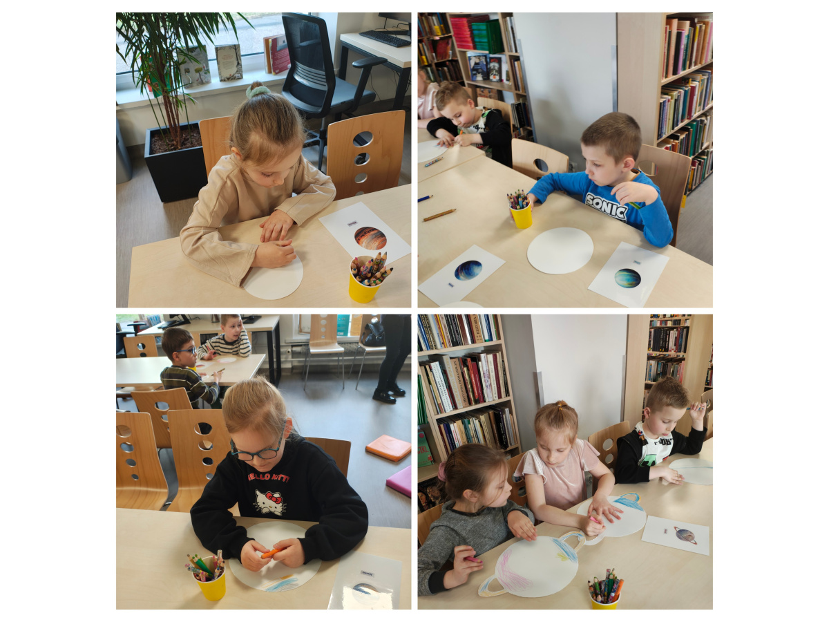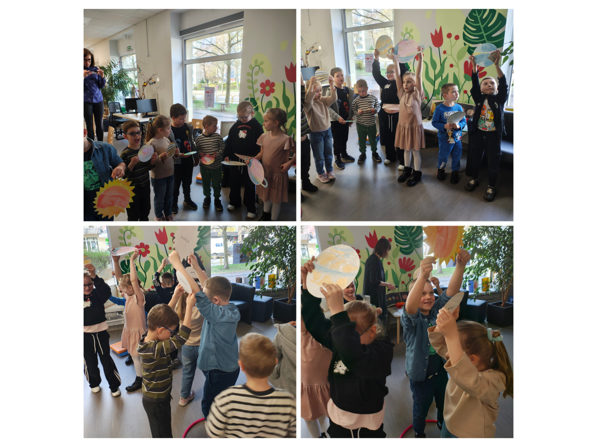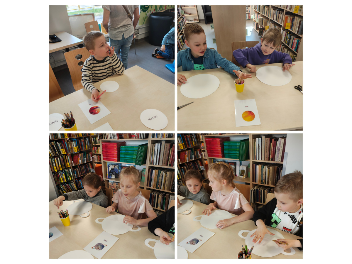 Dzieci z grupy Biedronki uczestniczyły w zajęciach bibliotecznych. Tematem zajęć był ,,Kosmos, planety gwiazdy".Sześciolatki poznały pojęcia związane z kosmosem: Układ Słoneczny, planeta, gwiazda, orbita, droga mleczna. Dowiedziały się czym różni się planeta od gwiazdy. Poznały planety Układu Słonecznego, odczytywały ich nazwy, układały wg kolejności ich położenia względem Słońca, zdobyły informacje nt. podróży kosmicznych i lądowania człowieka na księżycu. Zrozumieć kosmos pomógł im film edukacyjny ,, Kosmos i jego tajemnice". Poznały wygląd i strój astronauty. Tworzyły własne planety i odtworzyły ruch planet wokół Słońca w zabawie ruchowej do piosenki " W Układzie Słonecznym".