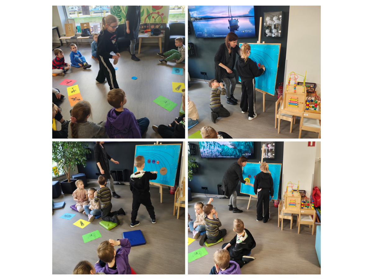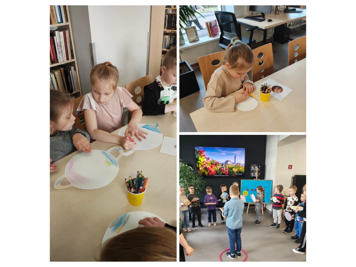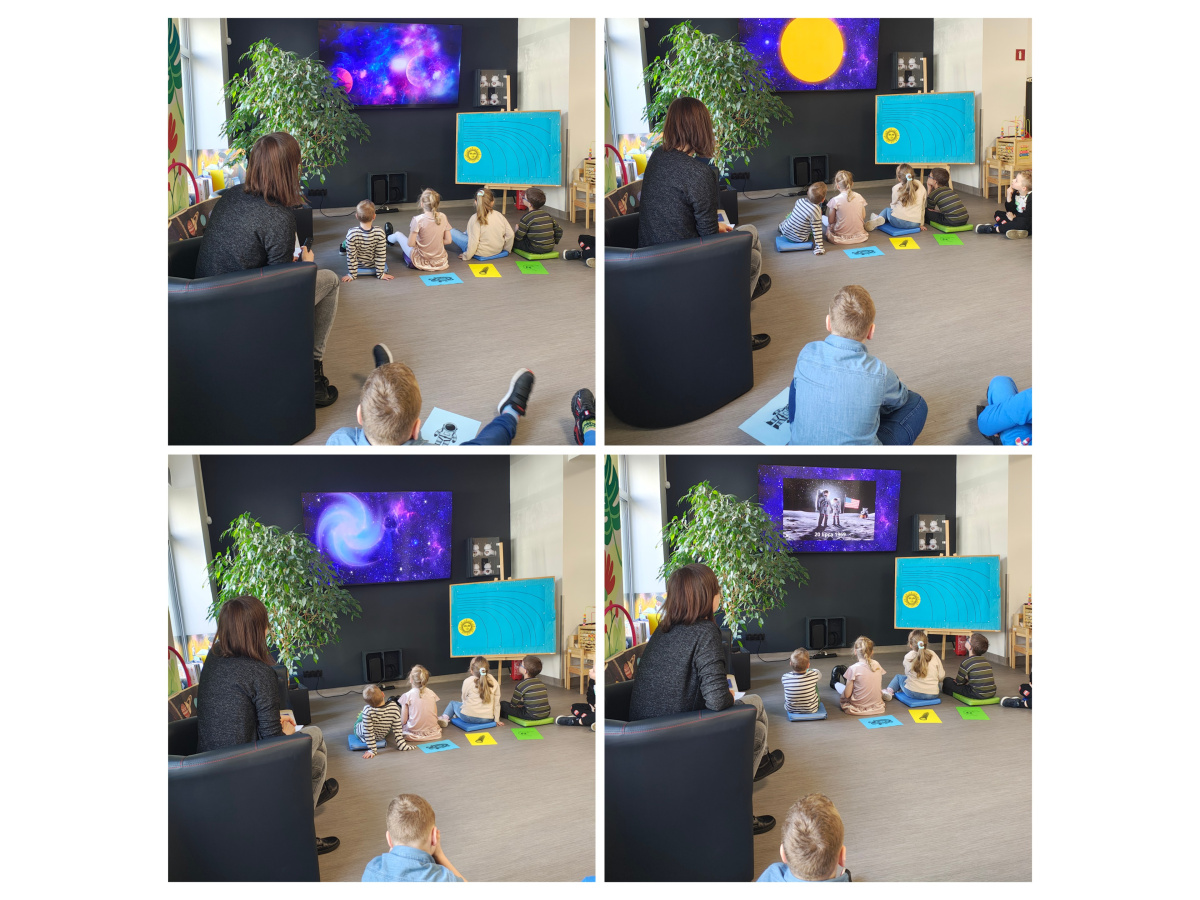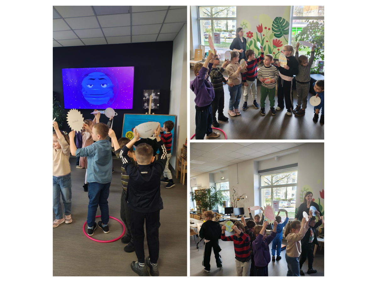 Dzieci z grupy Biedronki uczestniczyły w zajęciach bibliotecznych. Tematem zajęć był ,,Kosmos, planety gwiazdy".Sześciolatki poznały pojęcia związane z kosmosem: Układ Słoneczny, planeta, gwiazda, orbita, droga mleczna. Dowiedziały się czym różni się planeta od gwiazdy. Poznały planety Układu Słonecznego, odczytywały ich nazwy, układały wg kolejności ich położenia względem Słońca, zdobyły informacje nt. podróży kosmicznych i lądowania człowieka na księżycu. Zrozumieć kosmos pomógł im film edukacyjny ,, Kosmos i jego tajemnice". Poznały wygląd i strój astronauty. Tworzyły własne planety i odtworzyły ruch planet wokół Słońca w zabawie ruchowej do piosenki " W Układzie Słonecznym".