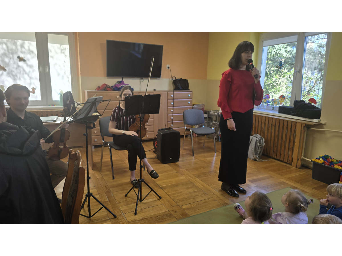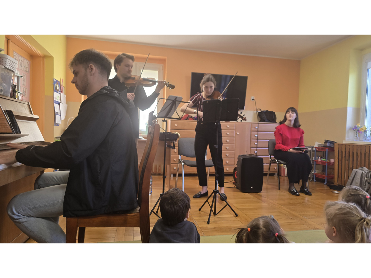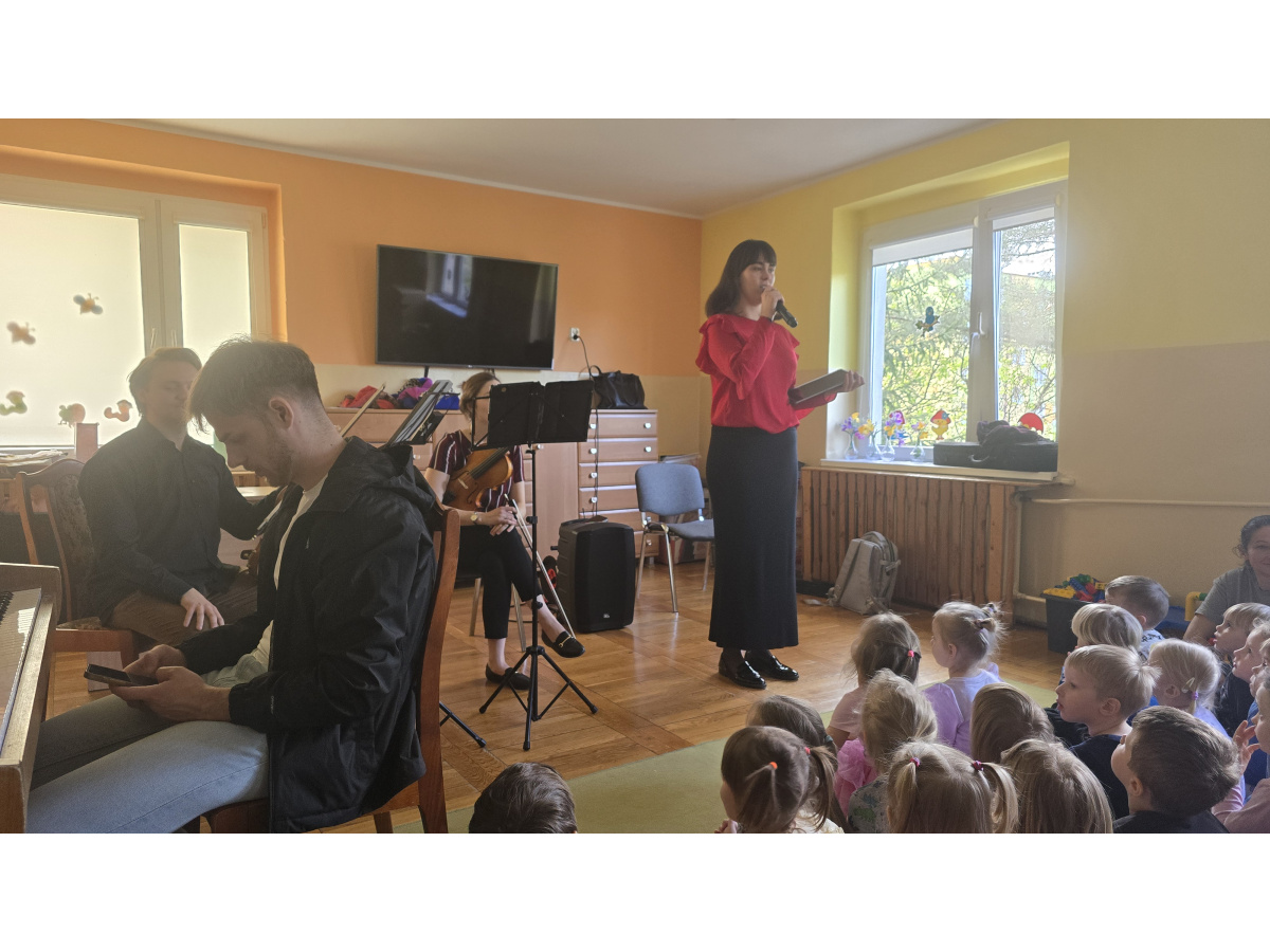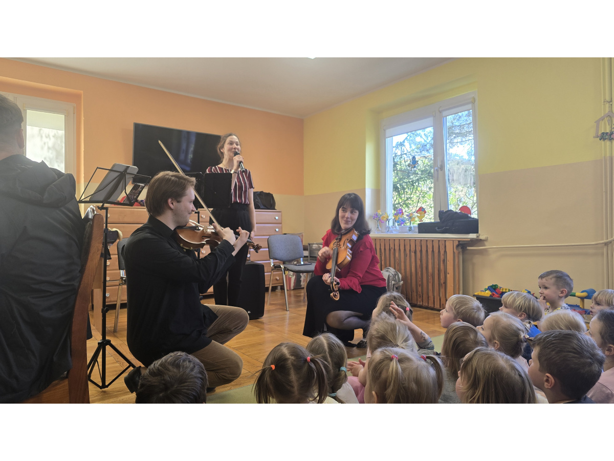 W naszym przedszkolu odbył się wyjątkowy koncert muzyków z Filharmonii Pomorskiej. Artyści zabrali dzieci w muzyczną podróż po różnych zakątkach przedszkola, prezentując brzmienie instrumentów i angażując przedszkolaki do wspólnej zabawy.