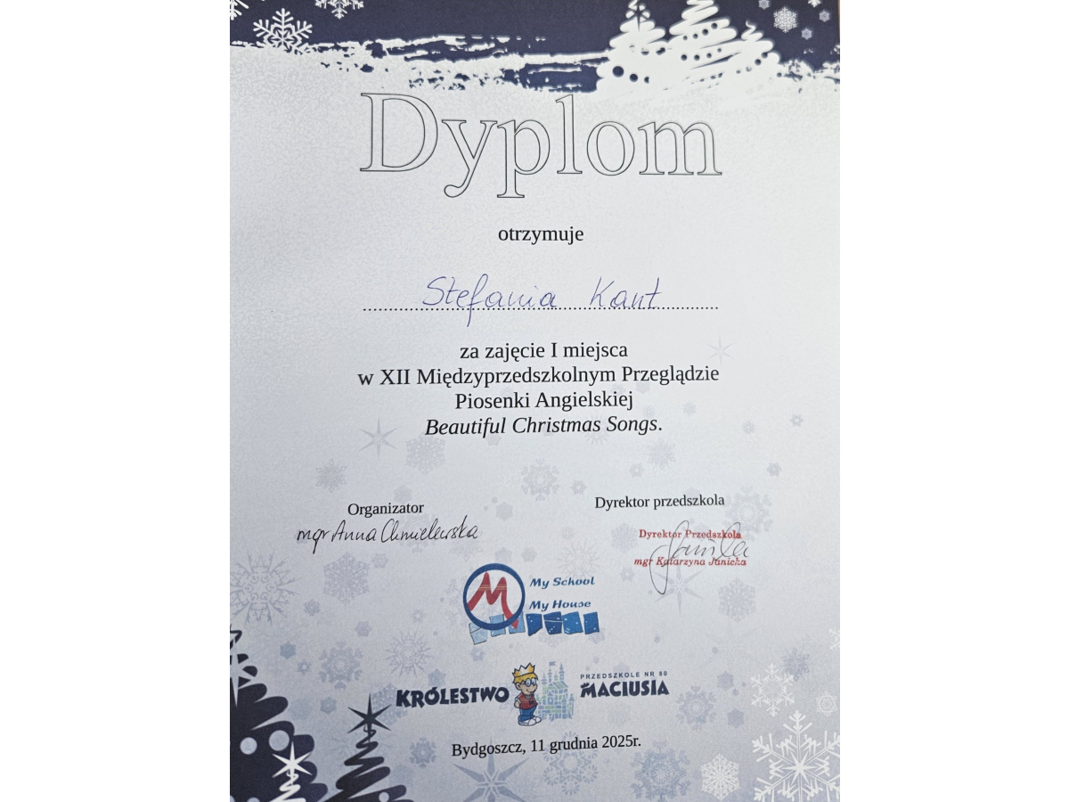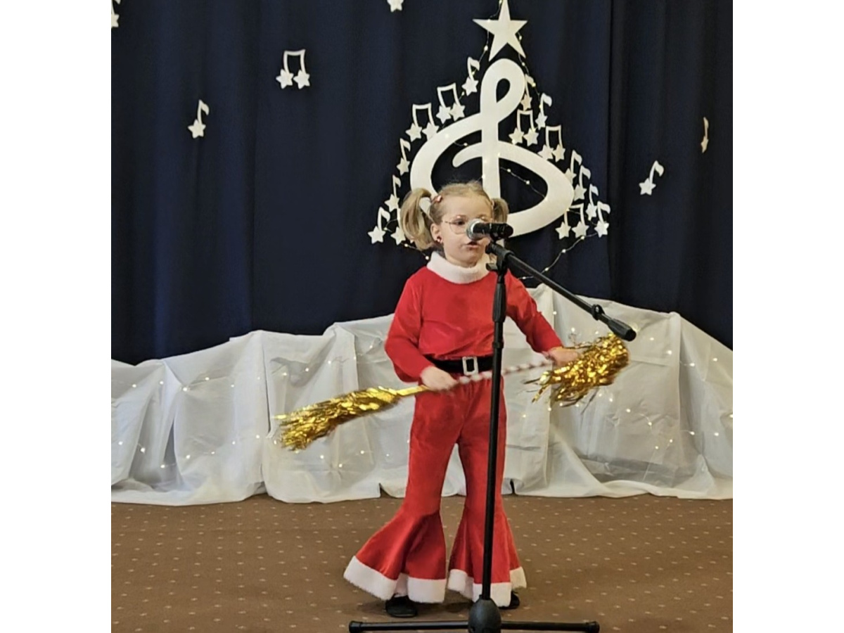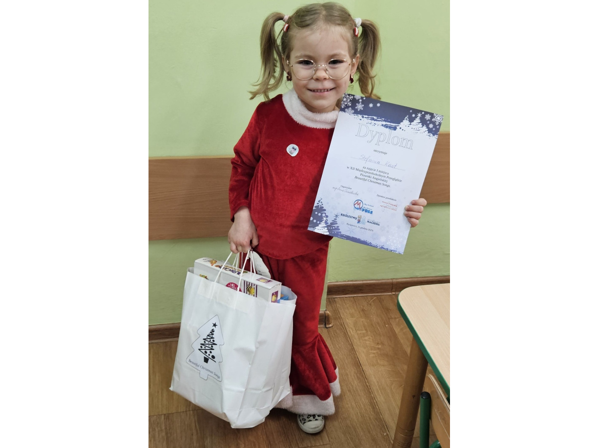Stefcia z grupy Zajączki zajęła I miejsce w prestiżowym konkursie piosenki angielskiej My Beautiful Christmas Song, zorganizowanym przez przedszkole nr 80. Stefcia zaśpiewała piosenkę "We Wish You a Merry Christmas" w wersji dance. Wielkie brawa i gratulacje.