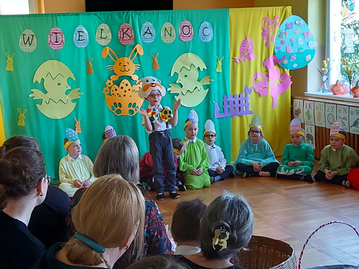 Tuż przed Wielkanocą grupa Pszczółek przygotowała wyjątkowe przedstawienie świąteczne dla całego przedszkola. Mali artyści zachwycili wszystkich pięknie przygotowaną inscenizacją – nie zabrakło barwnych dekoracji, wyśmienitych strojów i mnóstwa radości! Występ pełen był kolorów, świątecznych piosenek i wiosennego klimatu, który udzielił się całej widowni. Na zakończenie czekała niespodzianka – tradycyjny śmigus-dyngus, który wywołał salwy śmiechu i prawdziwie radosne zakończenie spotkania. Brawo dla "Pszczółek" za zaangażowanie i piękne emocje, które podarowały nam w tym wyjątkowym dniu!