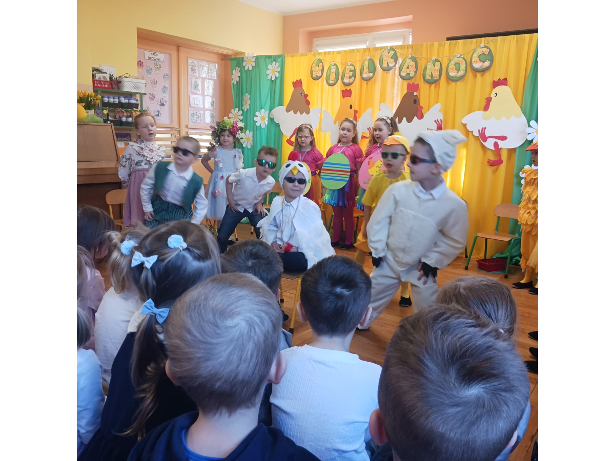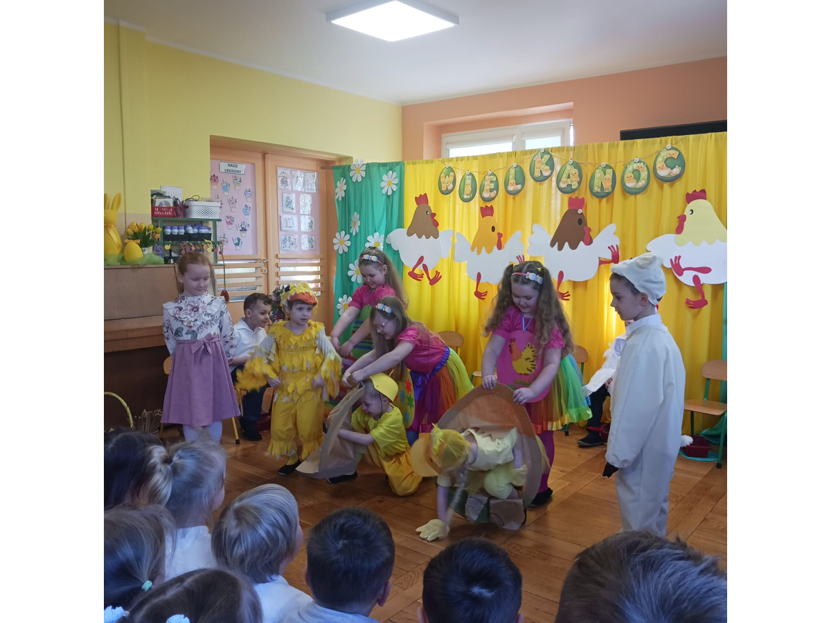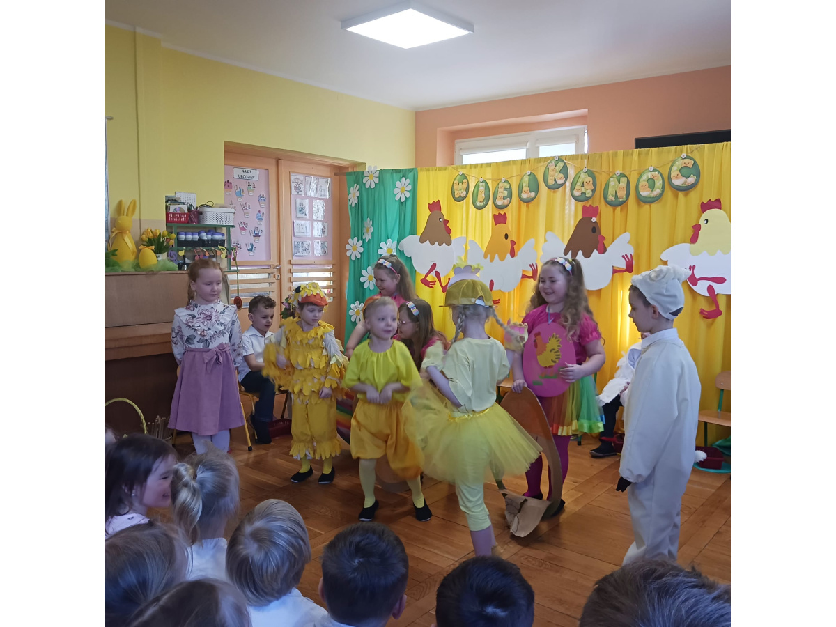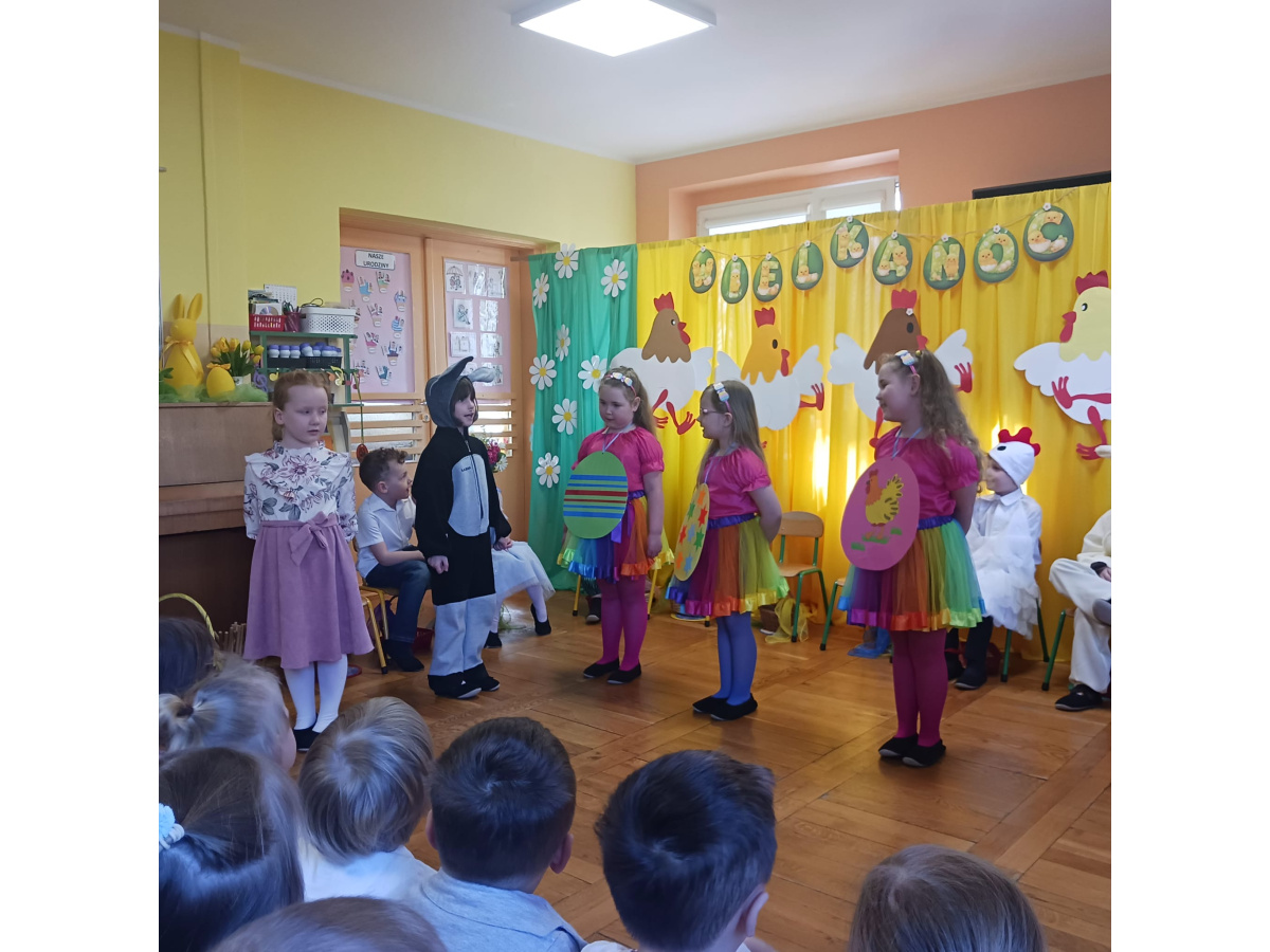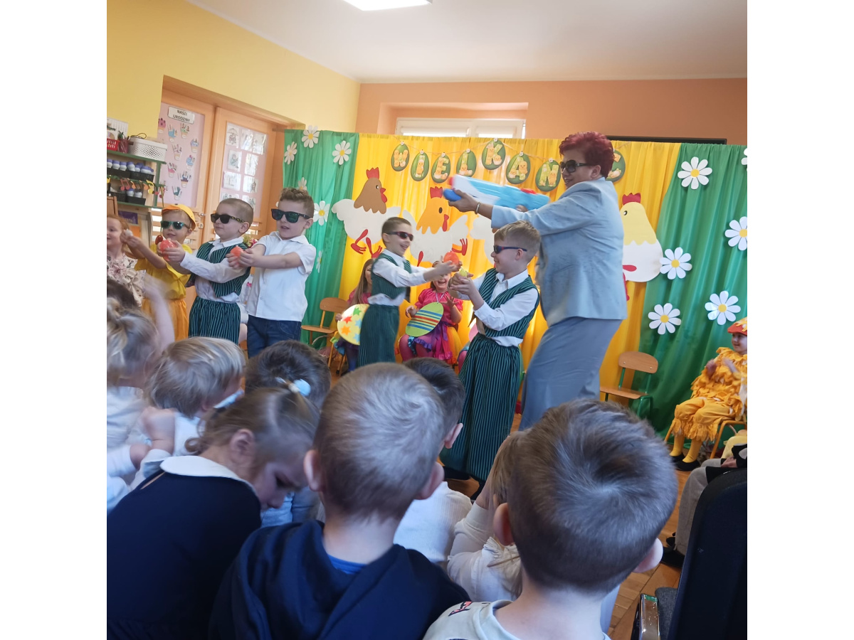 Dzieci z grupy Żabek przygotowały przedstawienie pt. „Dyrdymałki o pisankach”. Mali artyści z ogromnym zaangażowaniem zaprezentowali barwną i pełną humoru opowieść inspirowaną wielkanocnymi tradycjami. Na scenie pojawiło się wiele ciekawych i wesołych postaci, które wprowadziły widzów w świąteczny nastrój. Było radośnie, kolorowo i bardzo wiosennie. Zwieńczeniem występu był wesoły śmigus-dyngus, który wywołał wiele radości i stał się pięknym nawiązaniem do polskich zwyczajów wielkanocnych.