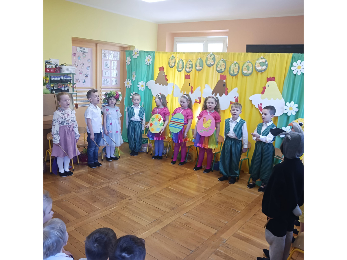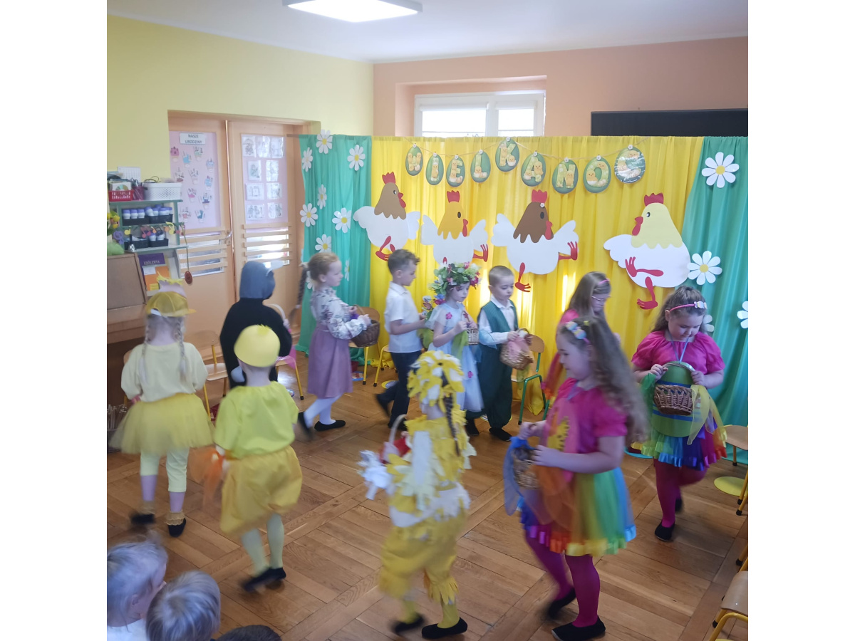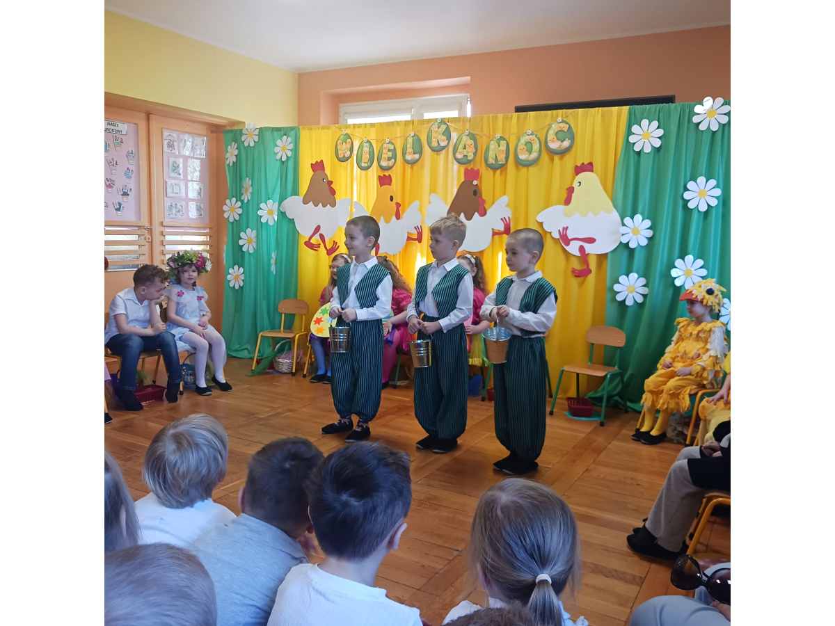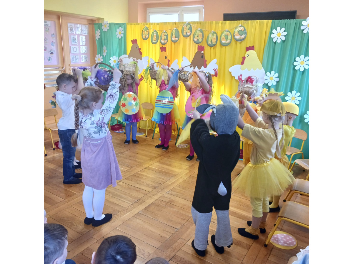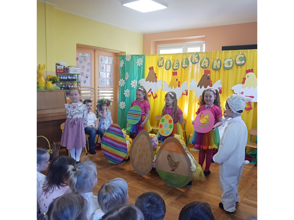 Dzieci z grupy Żabek przygotowały przedstawienie pt. „Dyrdymałki o pisankach”. Mali artyści z ogromnym zaangażowaniem zaprezentowali barwną i pełną humoru opowieść inspirowaną wielkanocnymi tradycjami. Na scenie pojawiło się wiele ciekawych i wesołych postaci, które wprowadziły widzów w świąteczny nastrój. Było radośnie, kolorowo i bardzo wiosennie. Zwieńczeniem występu był wesoły śmigus-dyngus, który wywołał wiele radości i stał się pięknym nawiązaniem do polskich zwyczajów wielkanocnych.