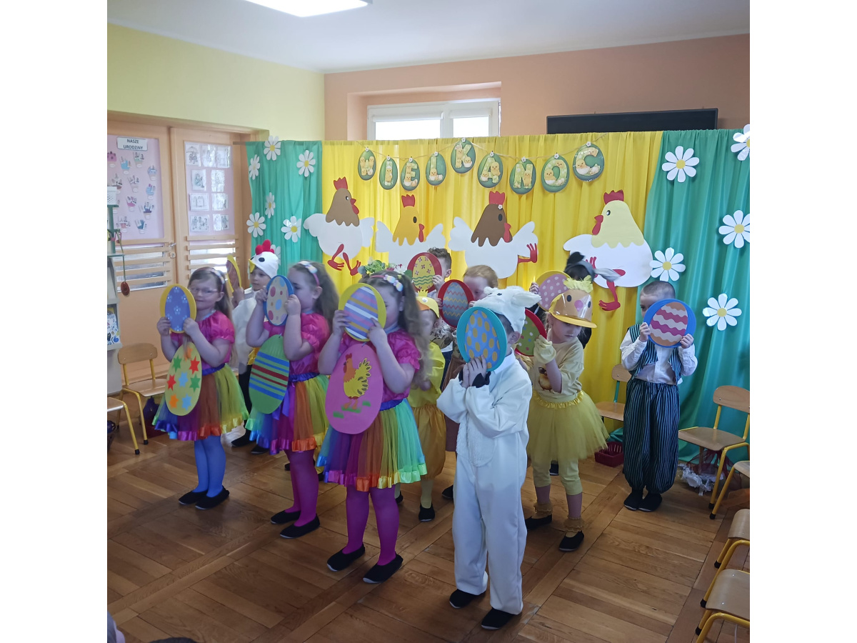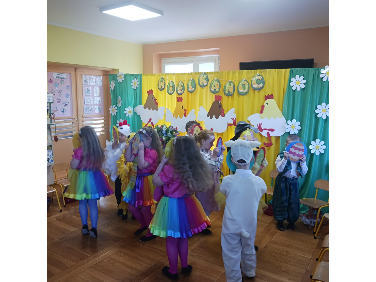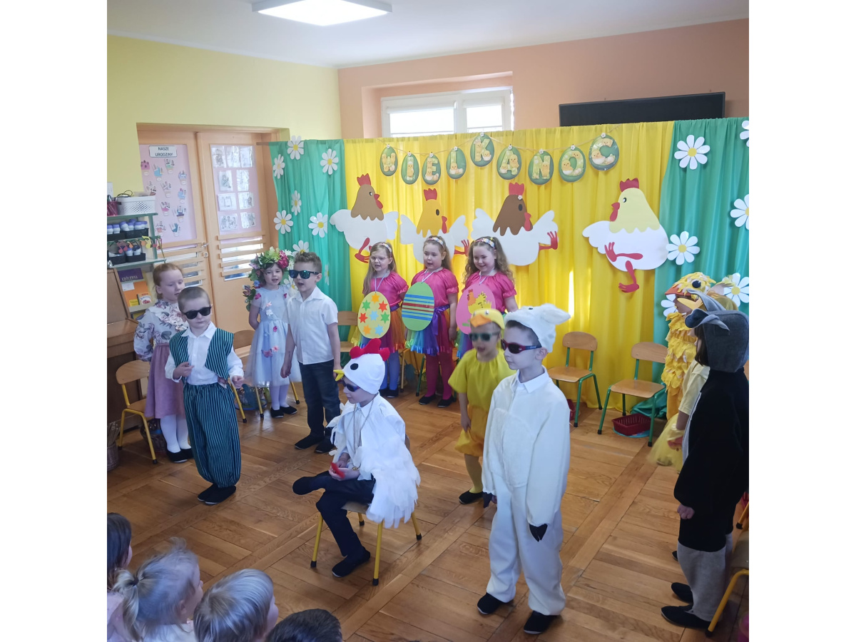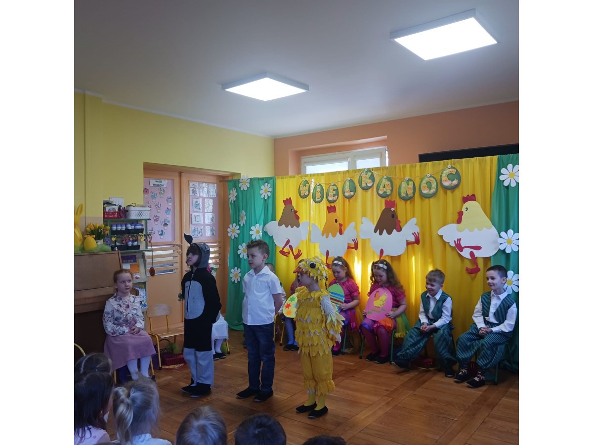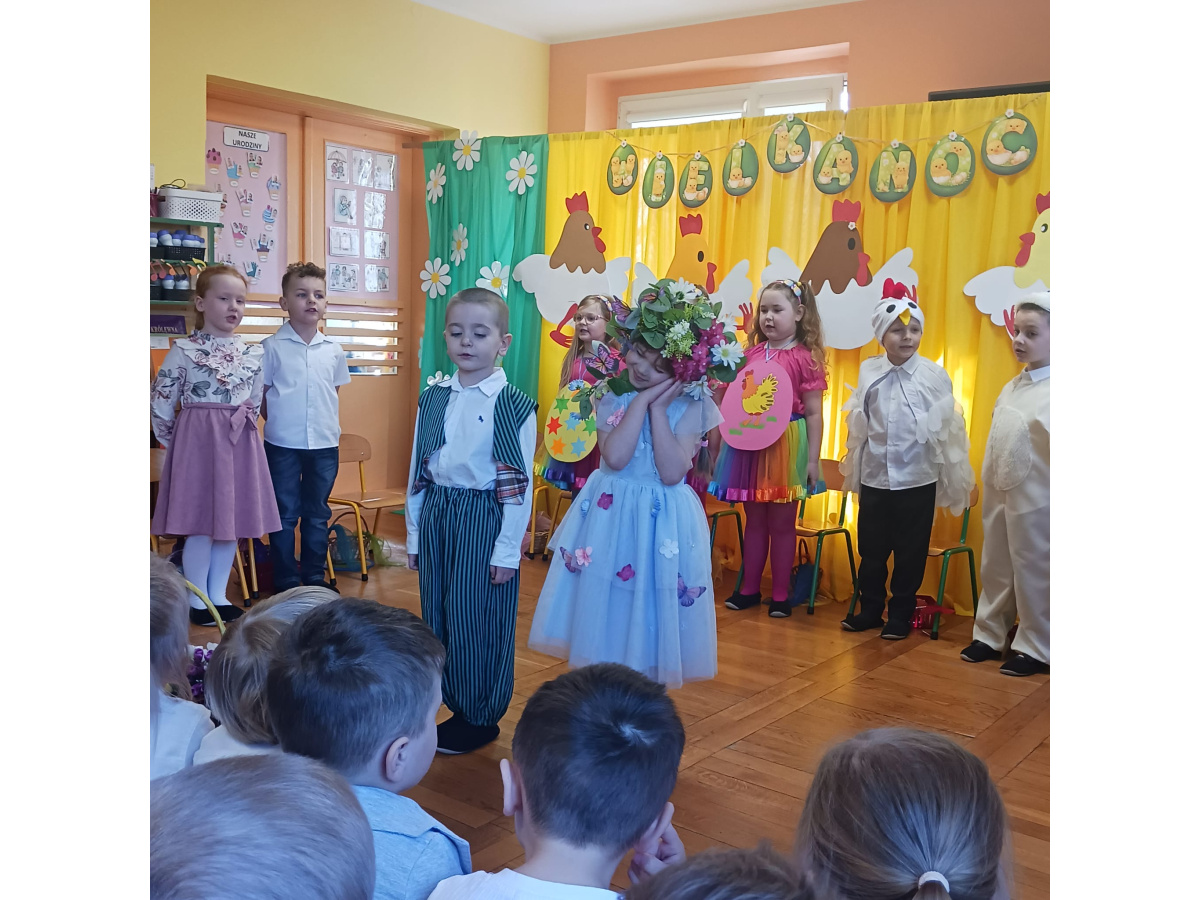 Dzieci z grupy Żabek przygotowały przedstawienie pt. „Dyrdymałki o pisankach”. Mali artyści z ogromnym zaangażowaniem zaprezentowali barwną i pełną humoru opowieść inspirowaną wielkanocnymi tradycjami. Na scenie pojawiło się wiele ciekawych i wesołych postaci, które wprowadziły widzów w świąteczny nastrój. Było radośnie, kolorowo i bardzo wiosennie. Zwieńczeniem występu był wesoły śmigus-dyngus, który wywołał wiele radości i stał się pięknym nawiązaniem do polskich zwyczajów wielkanocnych.