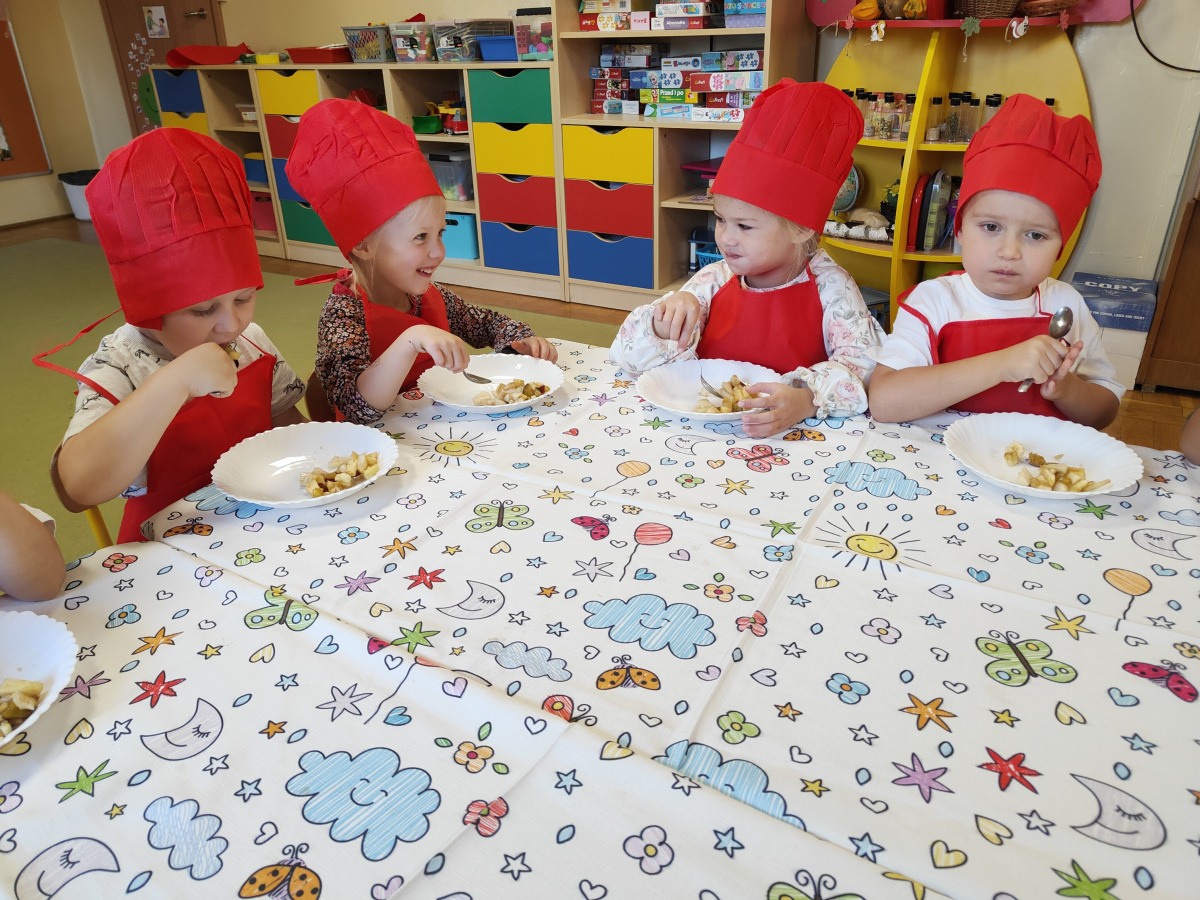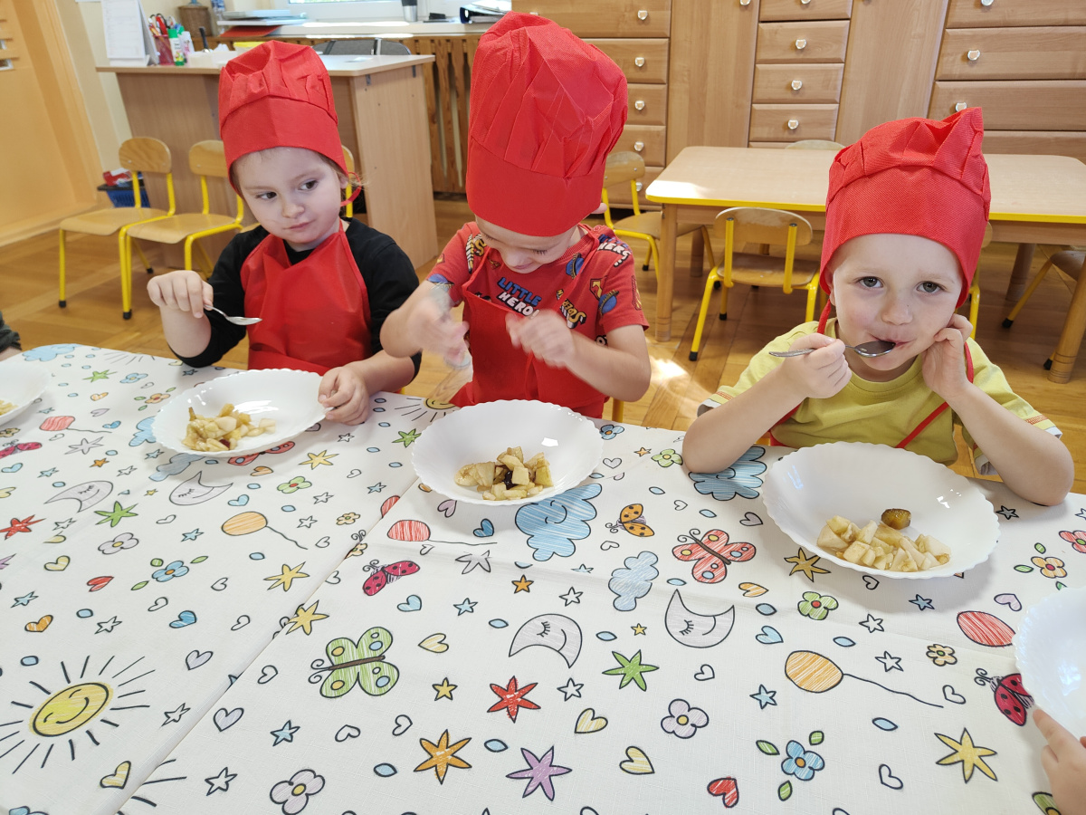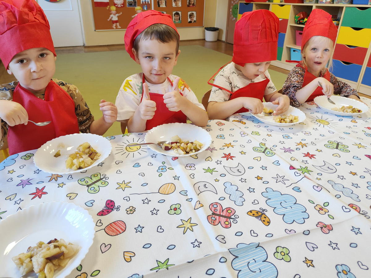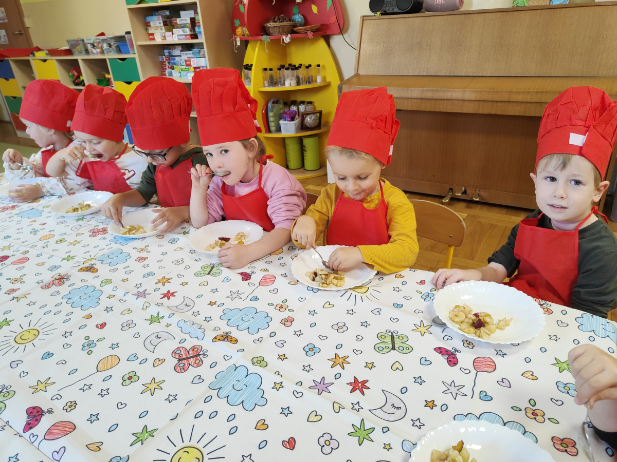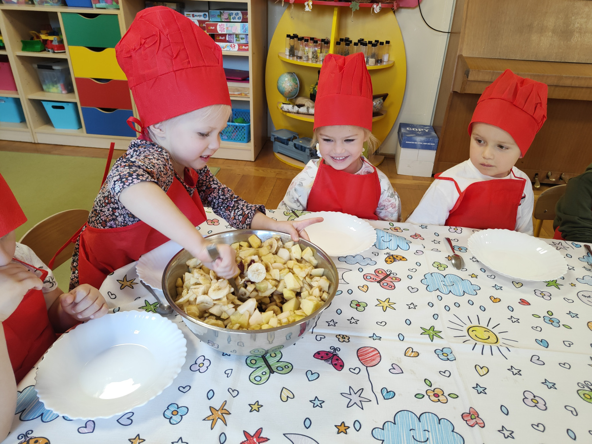 Grupa Pszczółki miała okazję przygotować owocową sałatkę. Przedszkolaki z wielką ochotą przystąpiły do krojenia jabłek, gruszek, śliwek i bananów. Wszystkie pokrojone składniki trafiły do dużej miski, gdzie następnie dzieci wymieszały wszystkie składniki. Zwieńczeniem pracy dzieci była konsumpcja pysznej sałatki. Dzieci z miłą chęcią zjadły swój wyrób z wielkim smakiem.