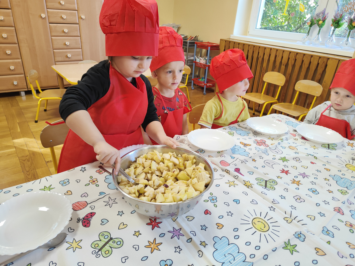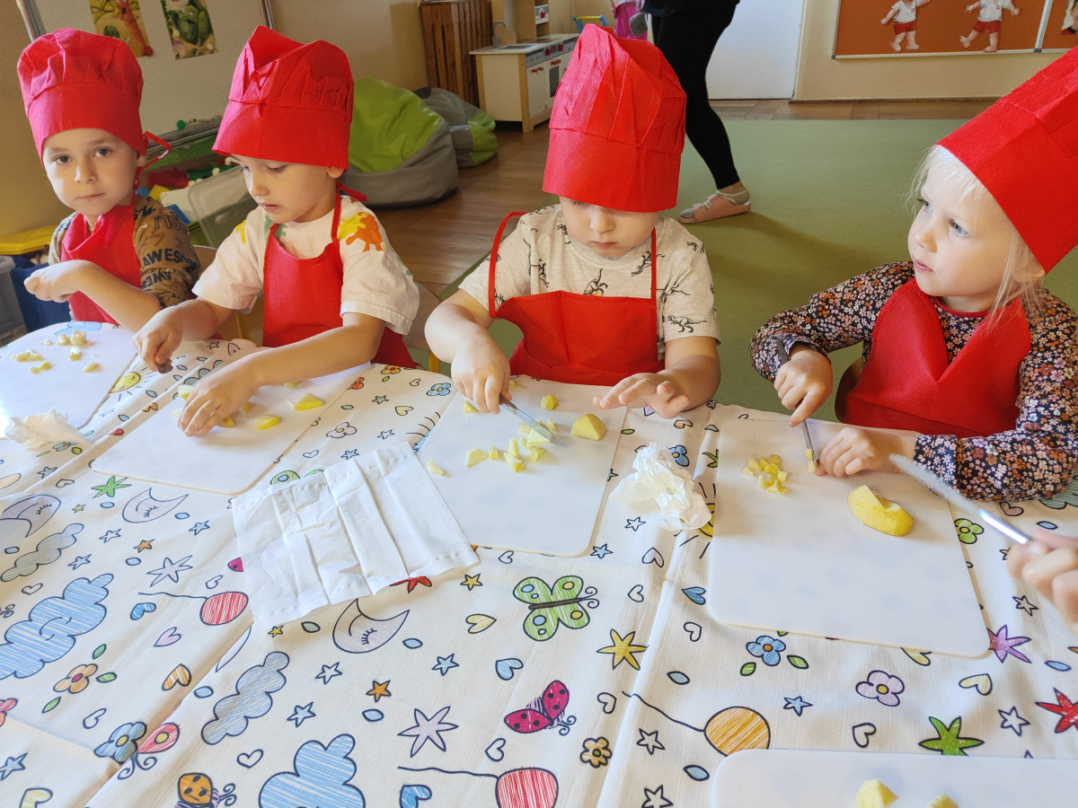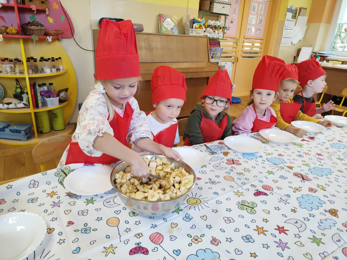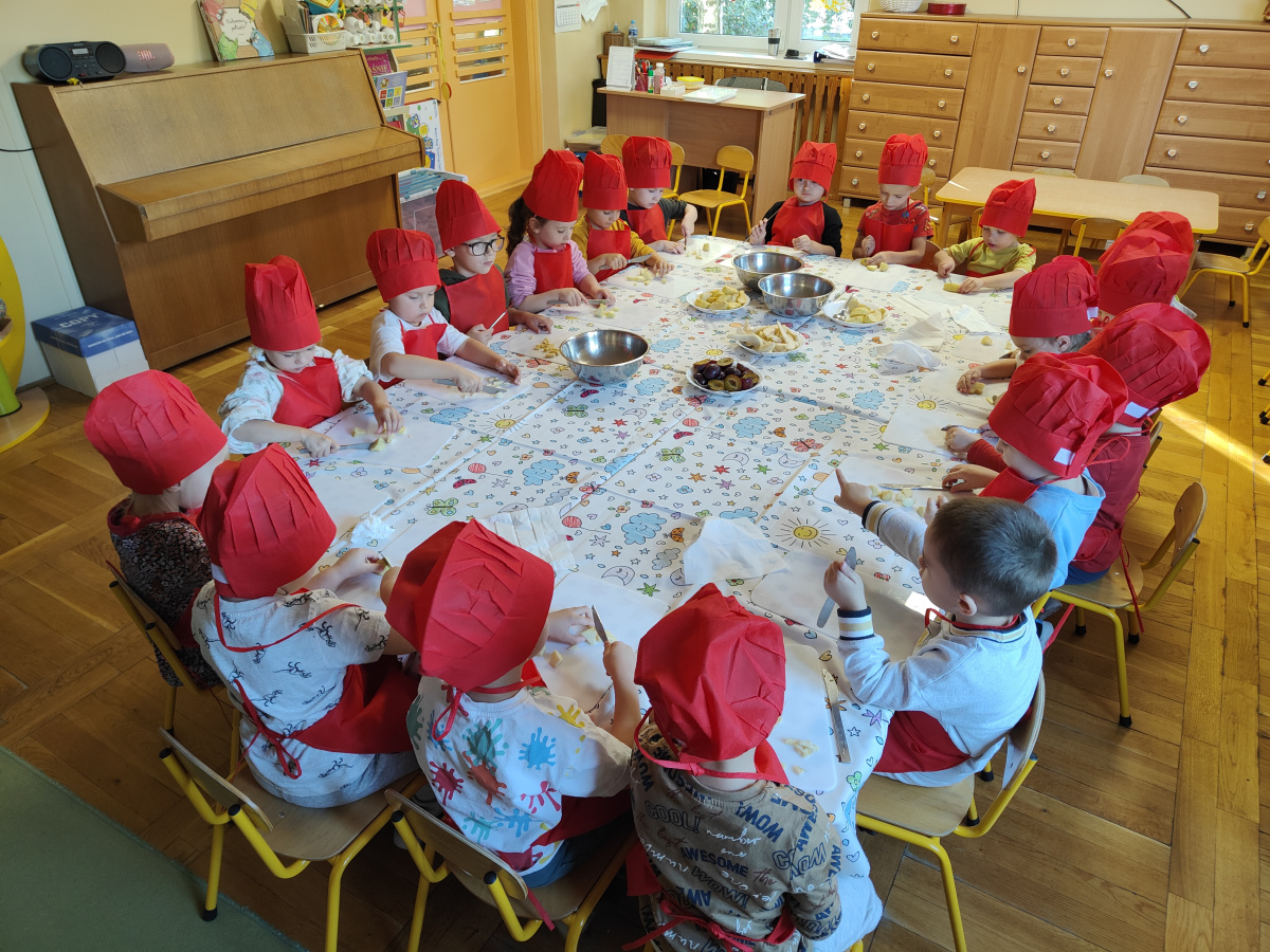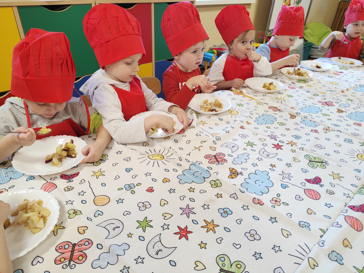 Grupa Pszczółki miała okazję przygotować owocową sałatkę. Przedszkolaki z wielką ochotą przystąpiły do krojenia jabłek, gruszek, śliwek i bananów. Wszystkie pokrojone składniki trafiły do dużej miski, gdzie następnie dzieci wymieszały wszystkie składniki. Zwieńczeniem pracy dzieci była konsumpcja pysznej sałatki. Dzieci z miłą chęcią zjadły swój wyrób z wielkim smakiem.