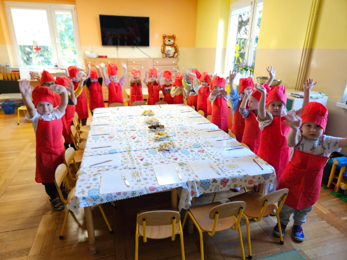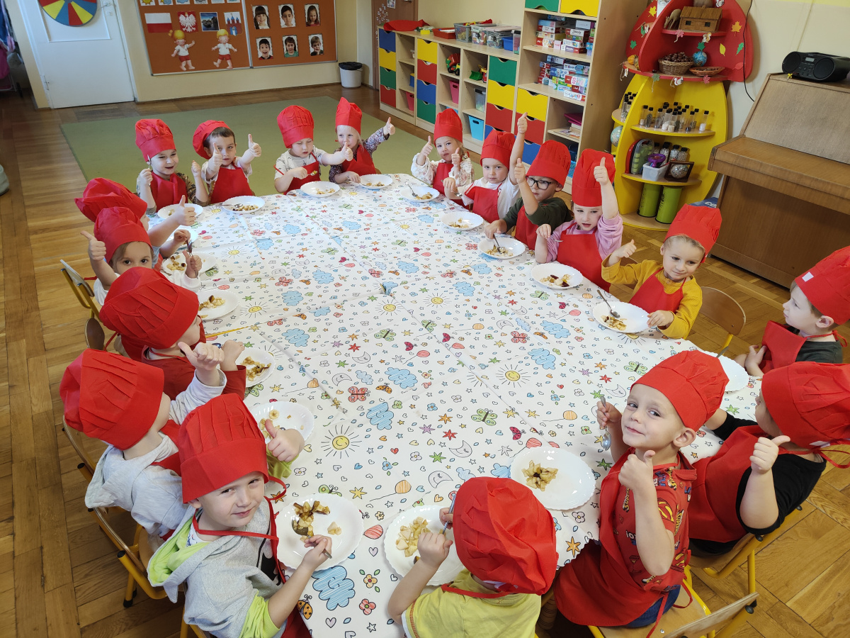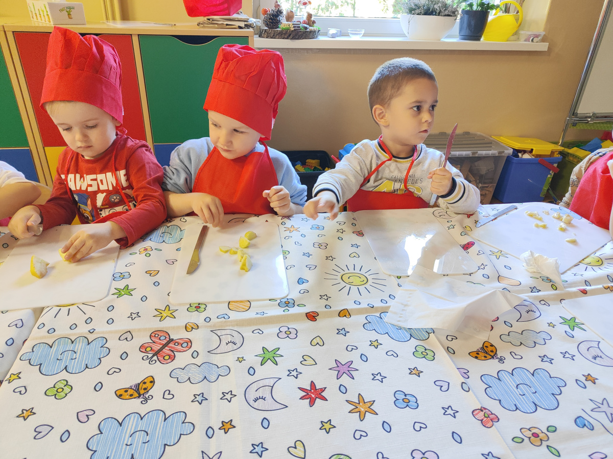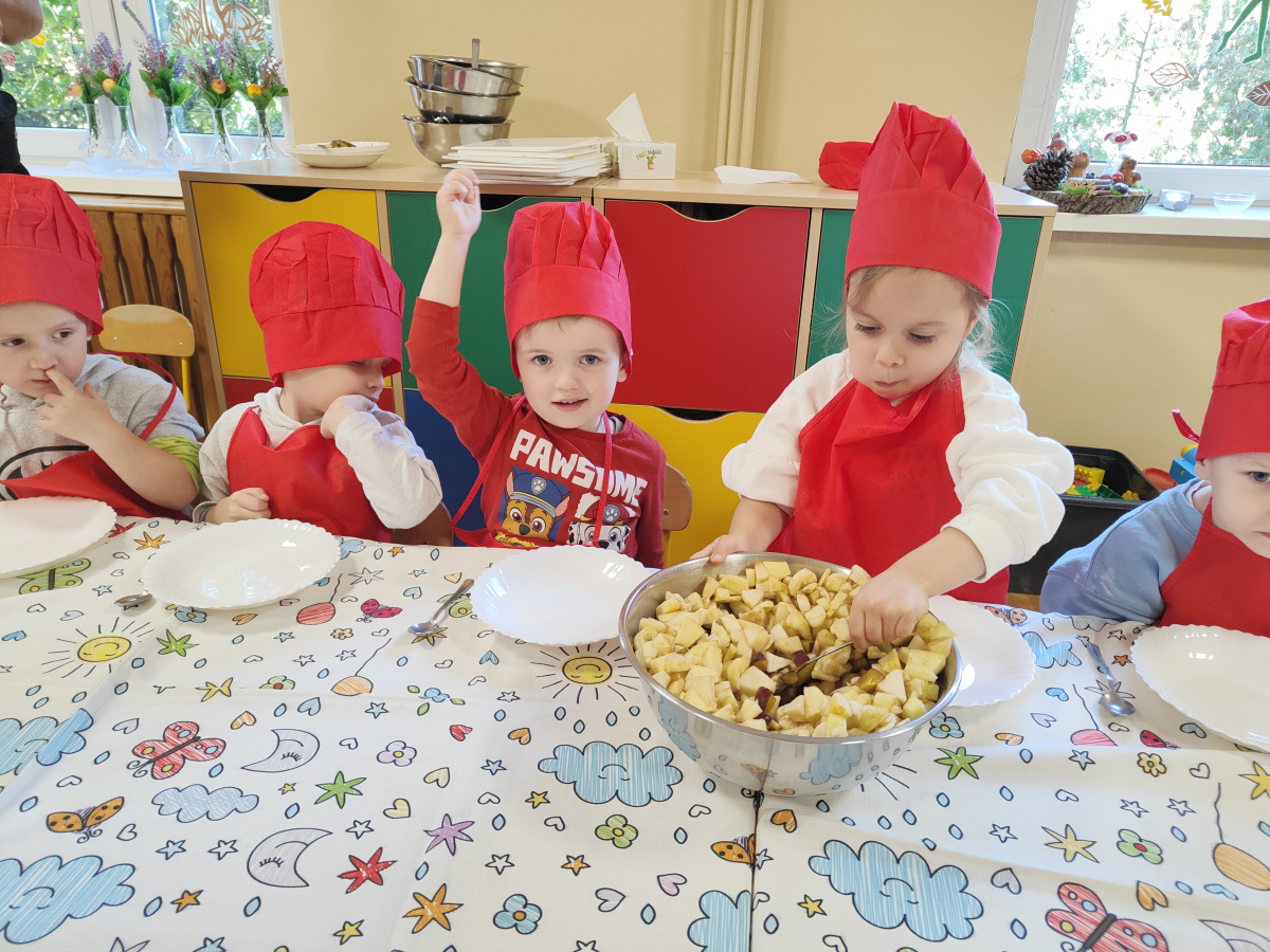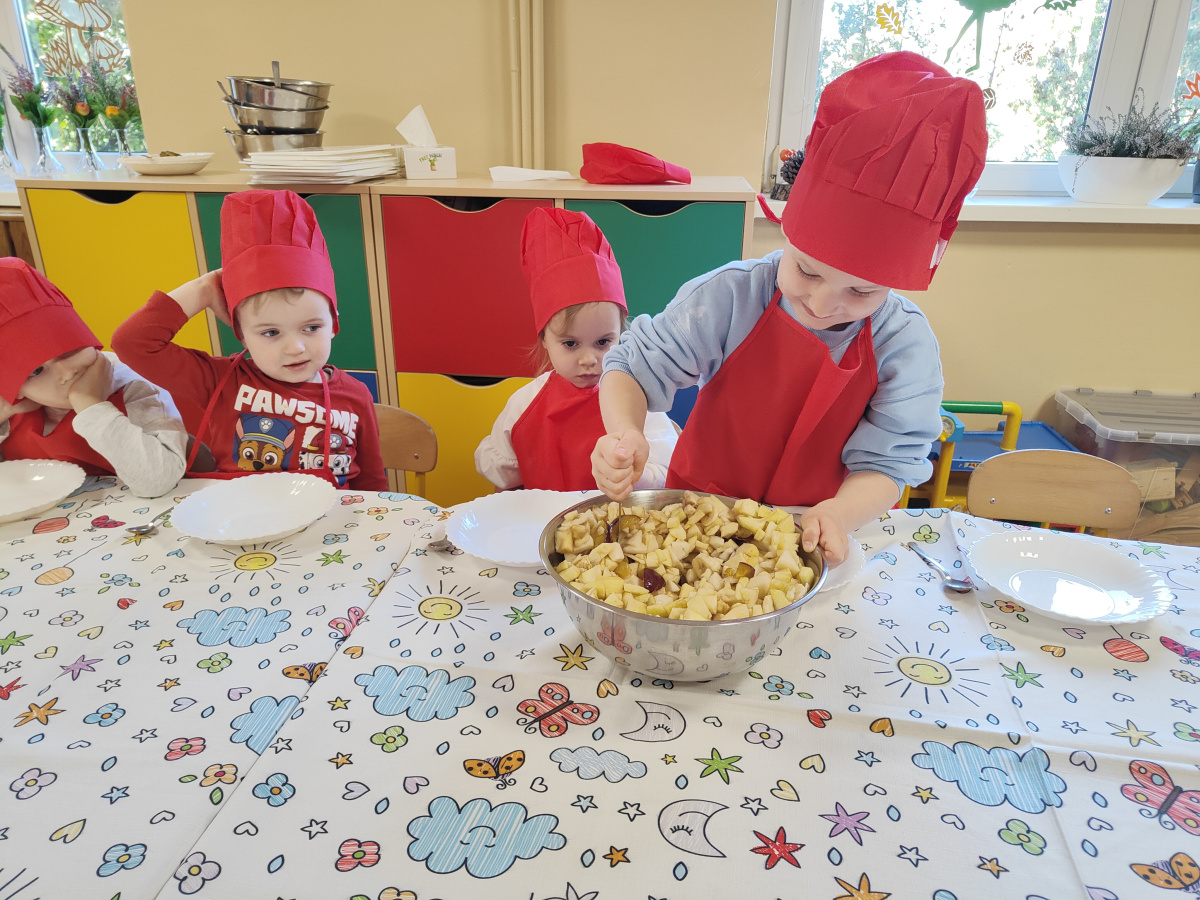 Grupa Pszczółki miała okazję przygotować owocową sałatkę. Przedszkolaki z wielką ochotą przystąpiły do krojenia jabłek, gruszek, śliwek i bananów. Wszystkie pokrojone składniki trafiły do dużej miski, gdzie następnie dzieci wymieszały wszystkie składniki. Zwieńczeniem pracy dzieci była konsumpcja pysznej sałatki. Dzieci z miłą chęcią zjadły swój wyrób z wielkim smakiem.