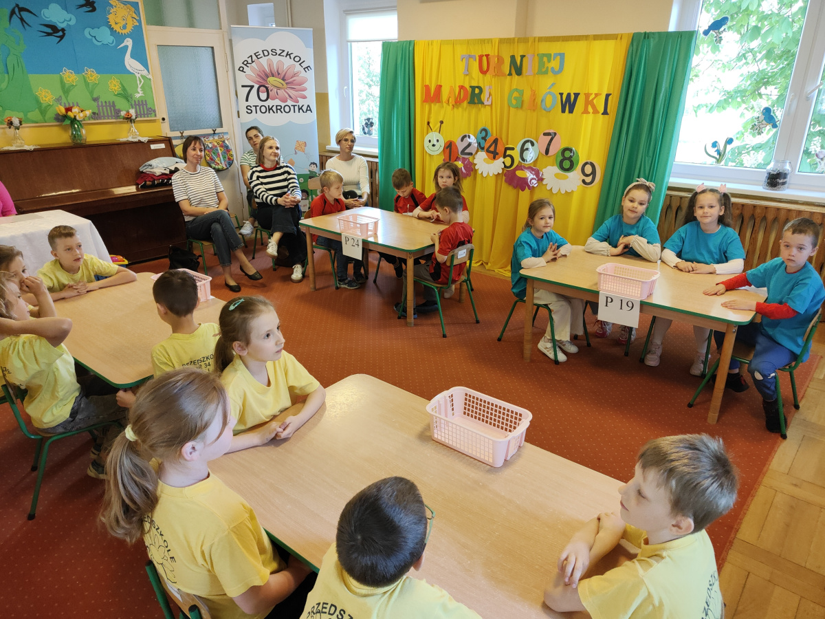 Dnia 7 maja w naszym przedszkolu odbyła się 14 edycja turnieju matematycznego "Mądre Główki". Gościliśmy drużyny z przedszkoli nr 19, 24 oraz 34 "Mali Odkrywcy". Przedszkole nr 70 reprezentowała grupa "Biedronek". Dzieci rozwiązywały zadania z zakresu kodowania, dodawania, działań matematycznych na tablicy interaktywnej. Wszyscy świetnie poradzili sobie z wyzwaniami. Uczestnicy otrzymali nagrody i dyplomy indywidualne oraz dla swojego przedszkola. Turniej został zakończony słodkim poczęstunkiem.
