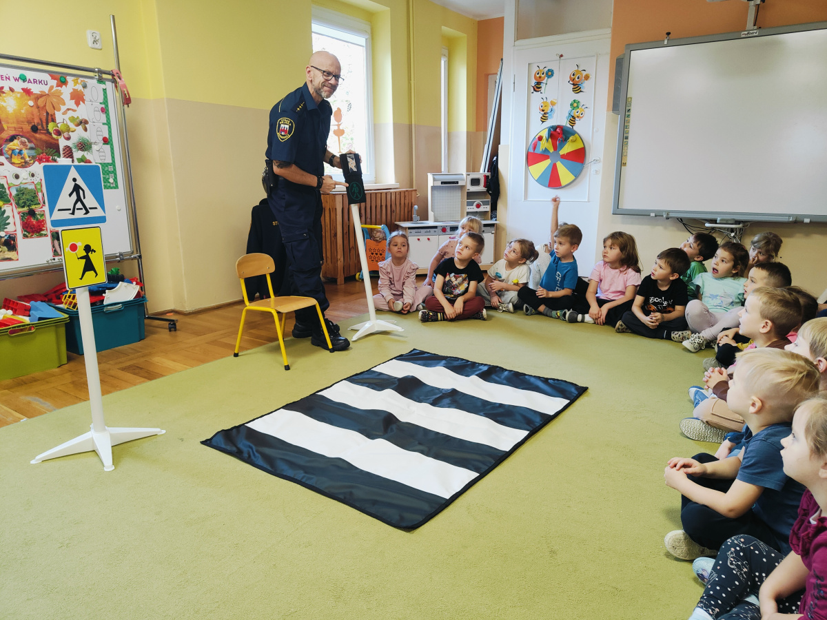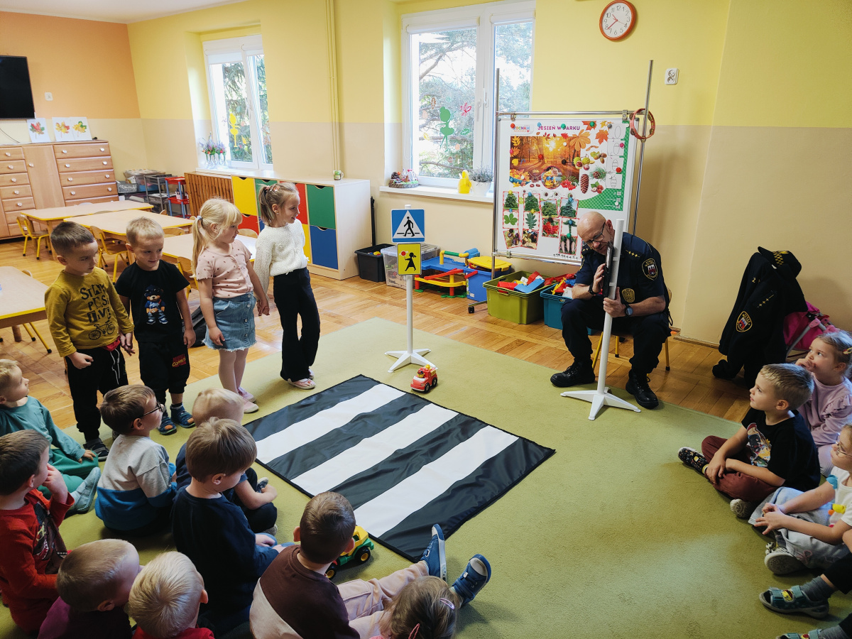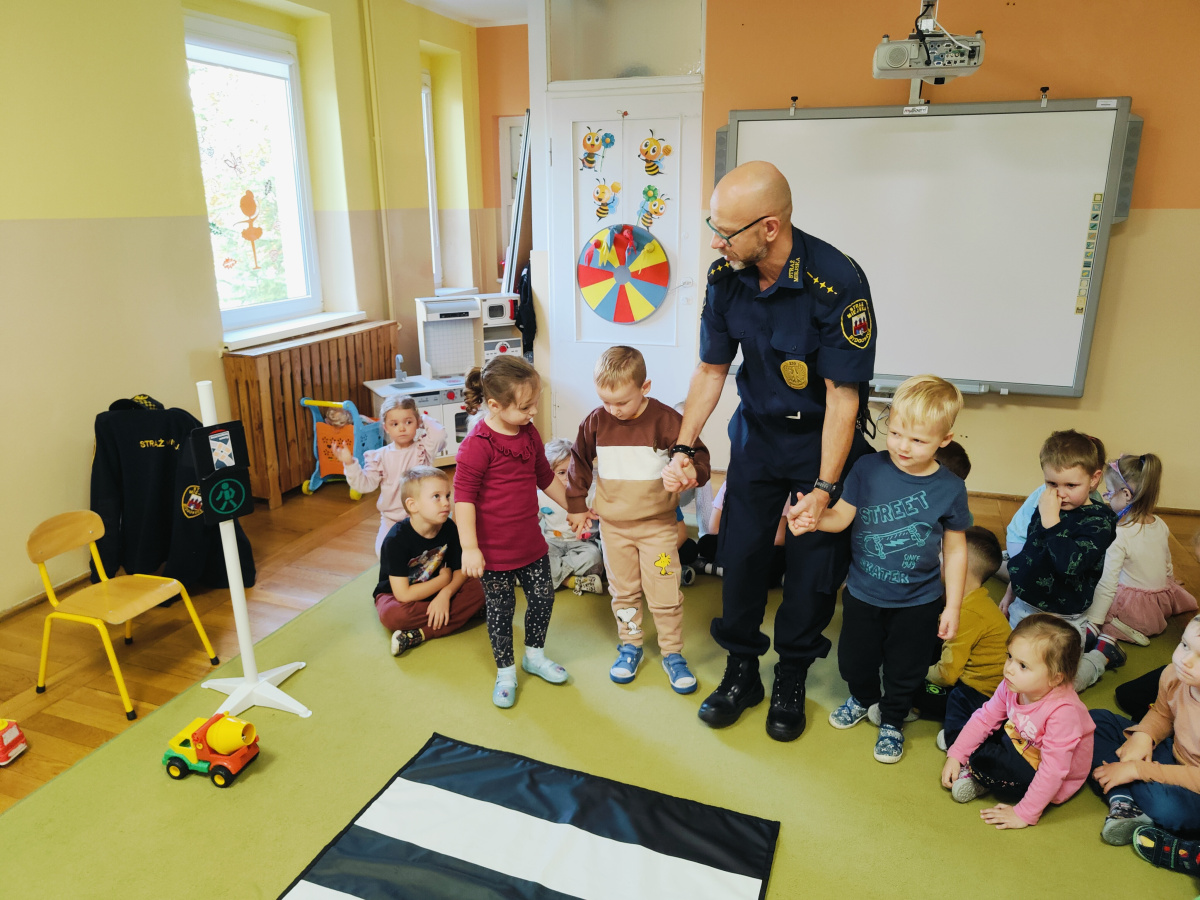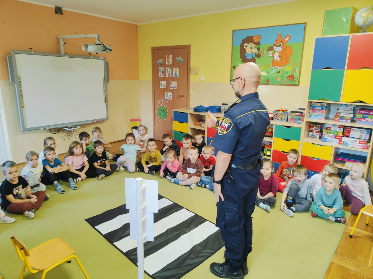 Nasze przedszkolaki miały okazję wziąć udział w zajęciach prowadzonych przez Strażnika miejskiego. Dzieci dowiedziały się jak bezpiecznie spędzać czas w domu oraz w przedszkolu. Jakie zagrożenia mogą wynikać z nieprzestrzegania zasad bezpieczeństwa. Przedszkolaki także utrwaliły zasady bezpiecznego poruszania się po przejściu dla pieszych.