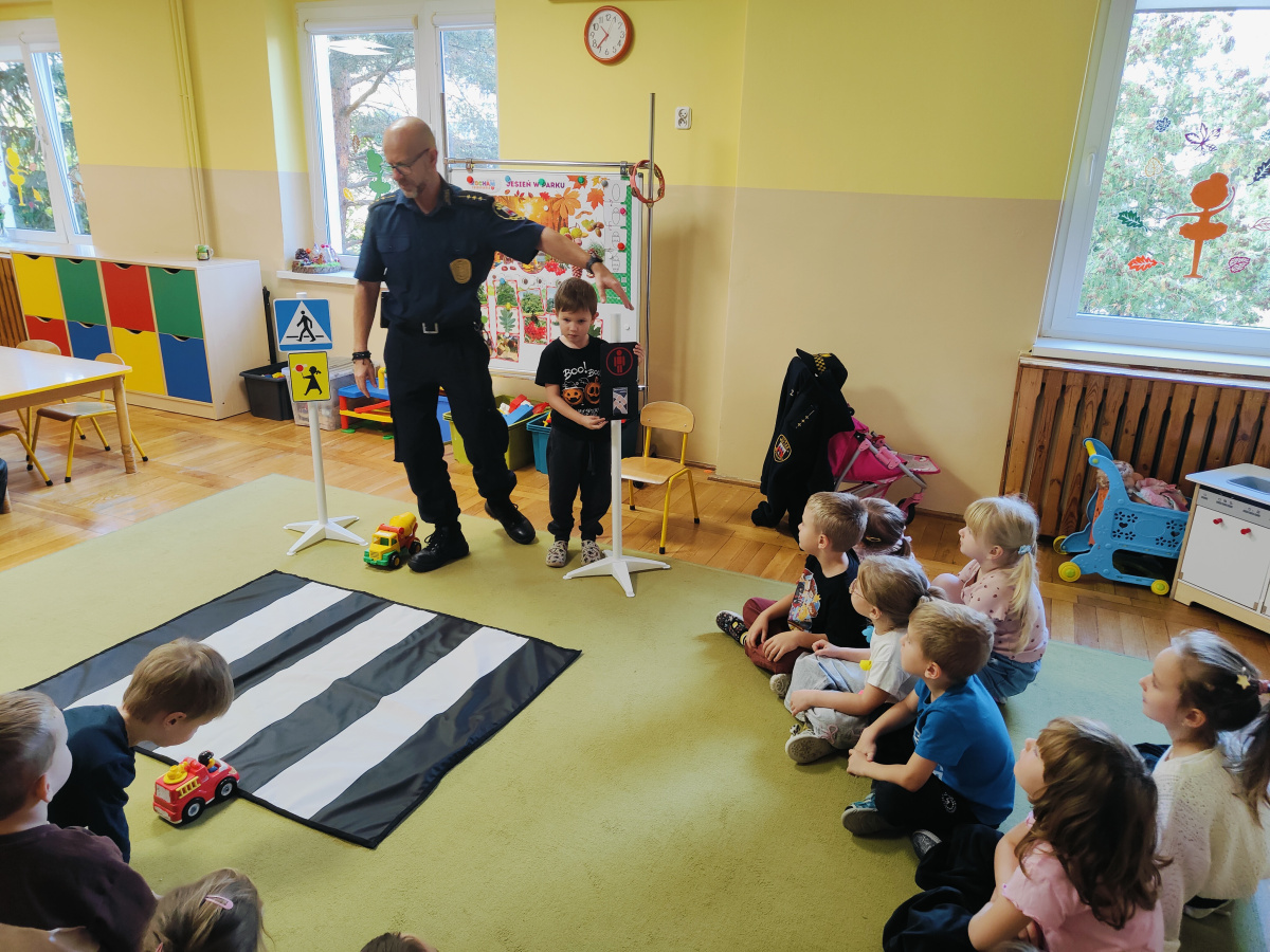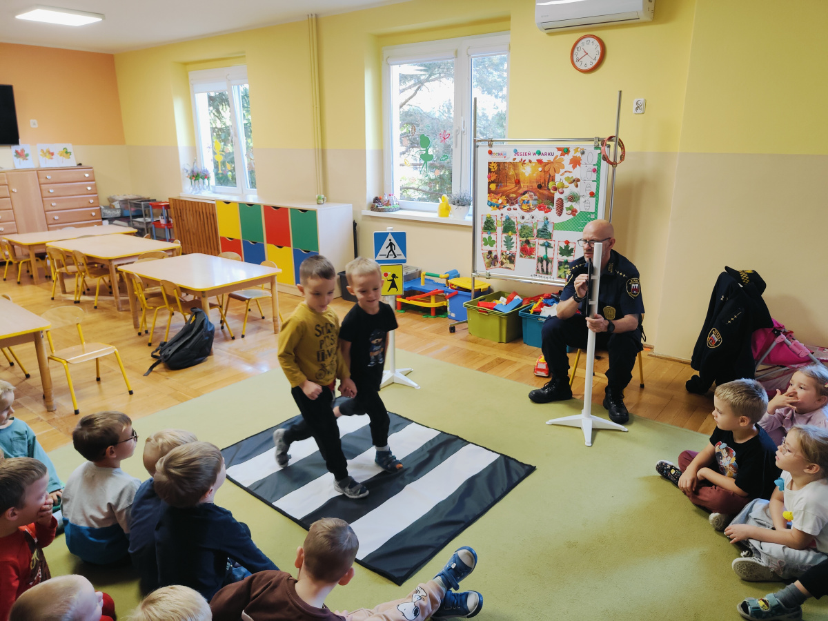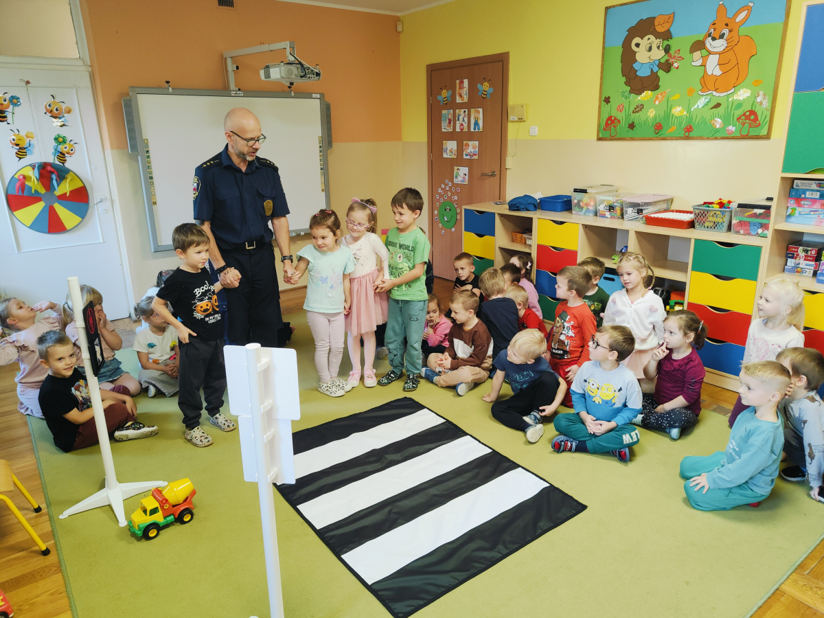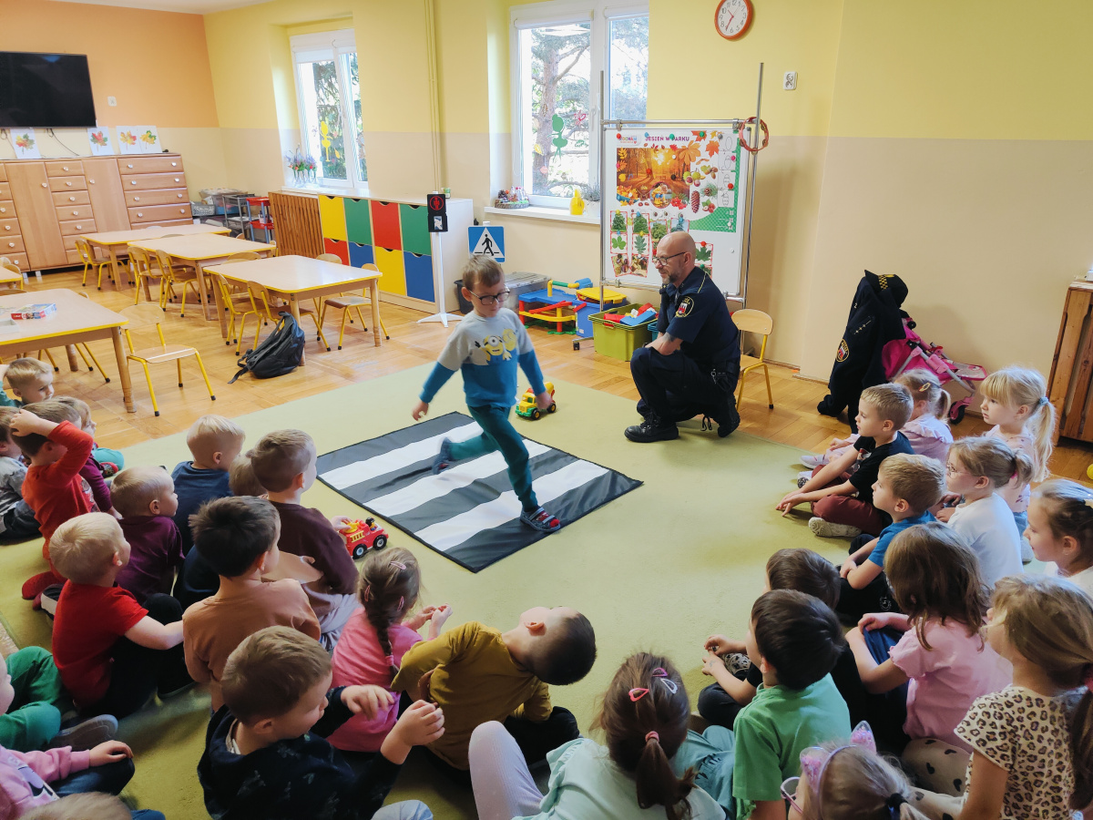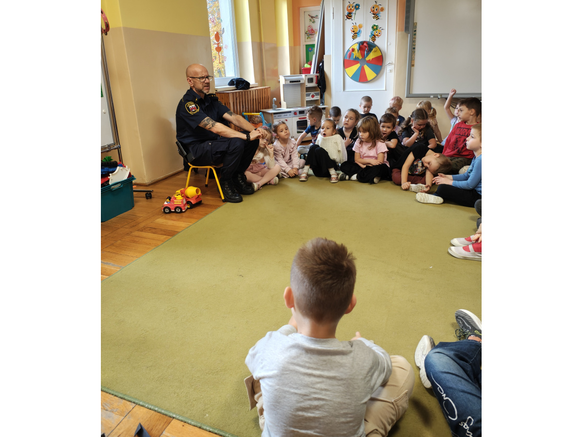 Nasze przedszkolaki miały okazję wziąć udział w zajęciach prowadzonych przez Strażnika miejskiego. Dzieci dowiedziały się jak bezpiecznie spędzać czas w domu oraz w przedszkolu. Jakie zagrożenia mogą wynikać z nieprzestrzegania zasad bezpieczeństwa. Przedszkolaki także utrwaliły zasady bezpiecznego poruszania się po przejściu dla pieszych.