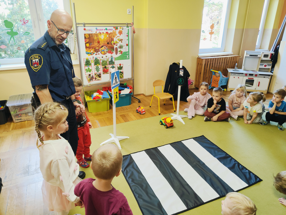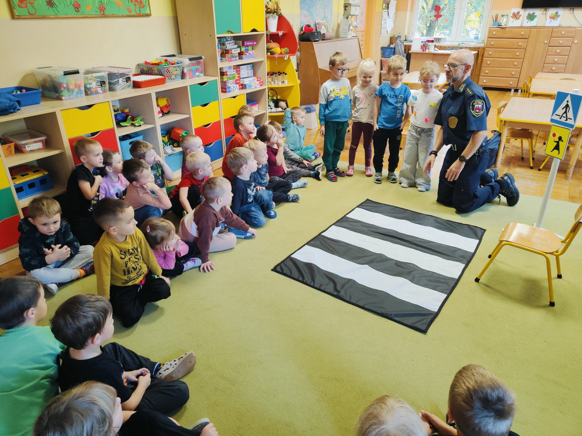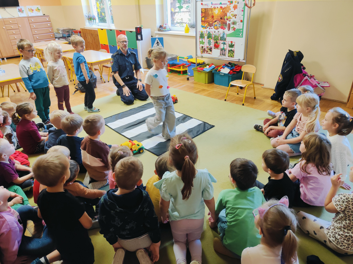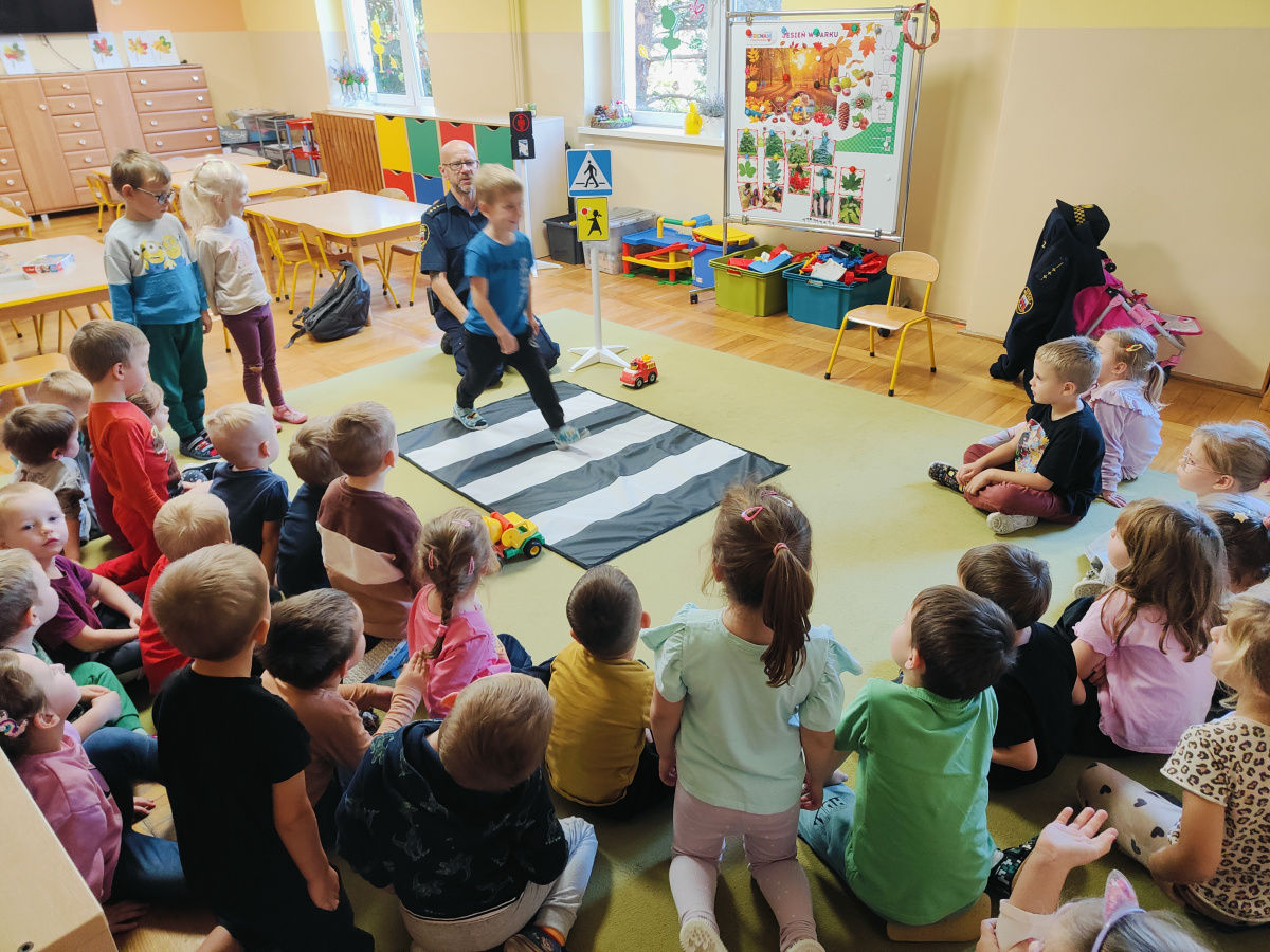 Nasze przedszkolaki miały okazję wziąć udział w zajęciach prowadzonych przez Strażnika miejskiego. Dzieci dowiedziały się jak bezpiecznie spędzać czas w domu oraz w przedszkolu. Jakie zagrożenia mogą wynikać z nieprzestrzegania zasad bezpieczeństwa. Przedszkolaki także utrwaliły zasady bezpiecznego poruszania się po przejściu dla pieszych.