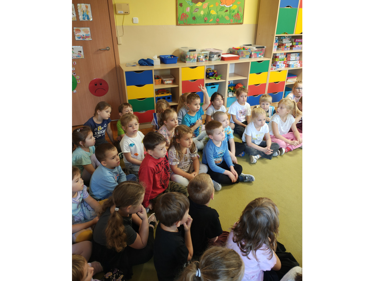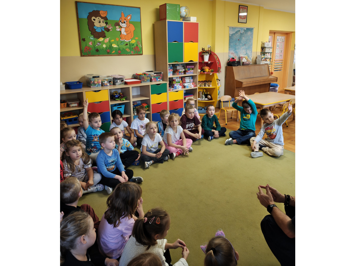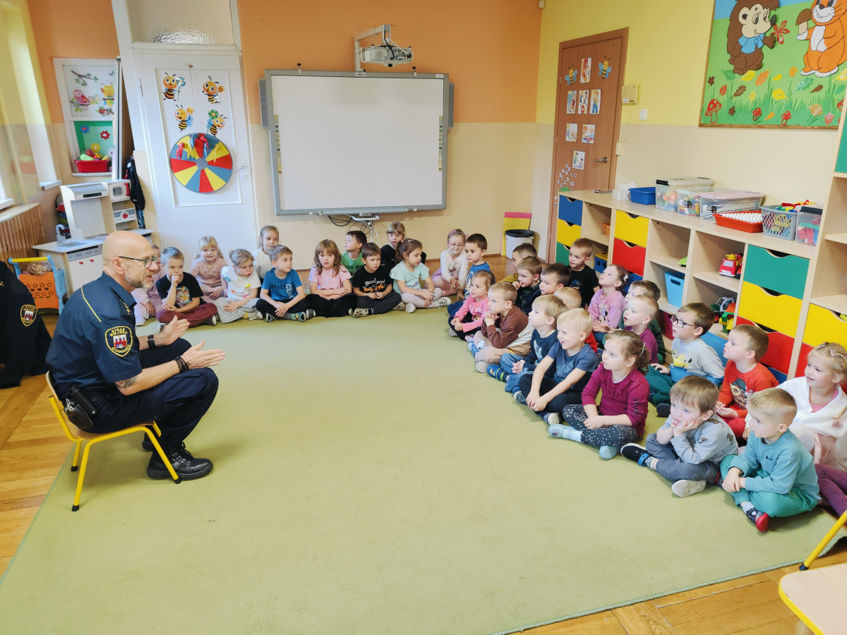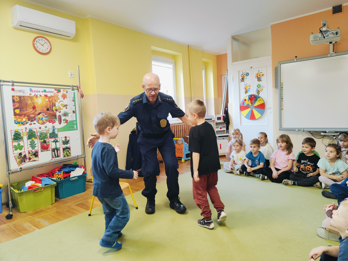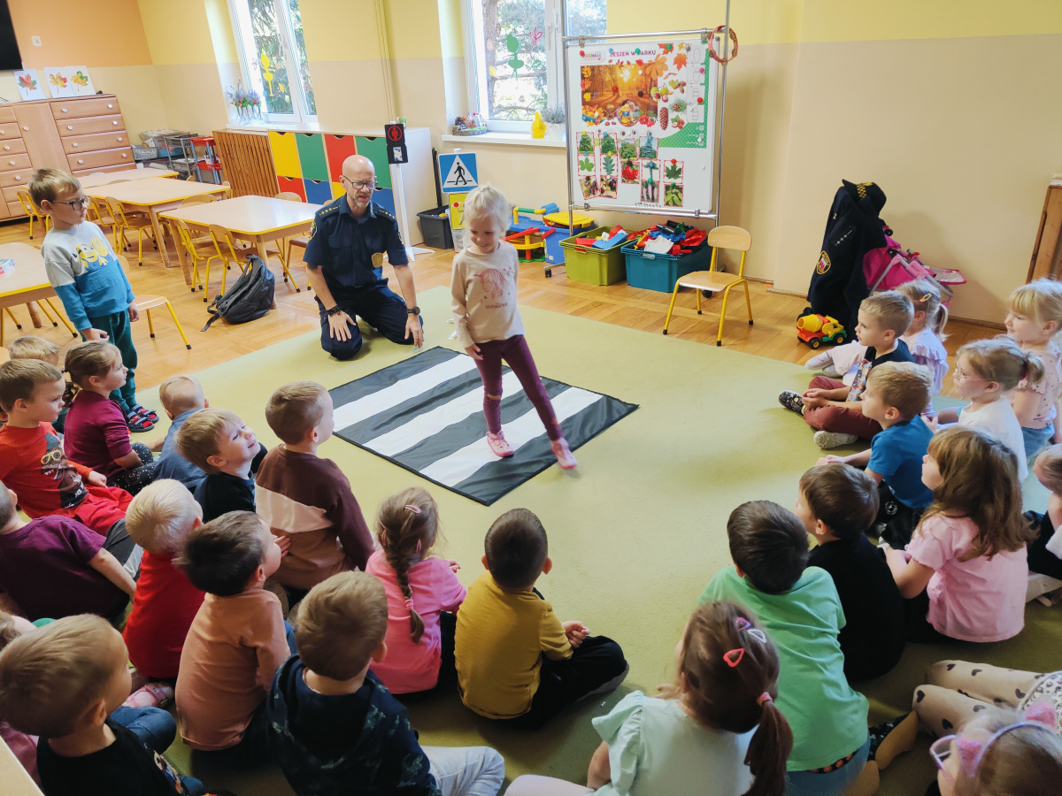 Nasze przedszkolaki miały okazję wziąć udział w zajęciach prowadzonych przez Strażnika miejskiego. Dzieci dowiedziały się jak bezpiecznie spędzać czas w domu oraz w przedszkolu. Jakie zagrożenia mogą wynikać z nieprzestrzegania zasad bezpieczeństwa. Przedszkolaki także utrwaliły zasady bezpiecznego poruszania się po przejściu dla pieszych.